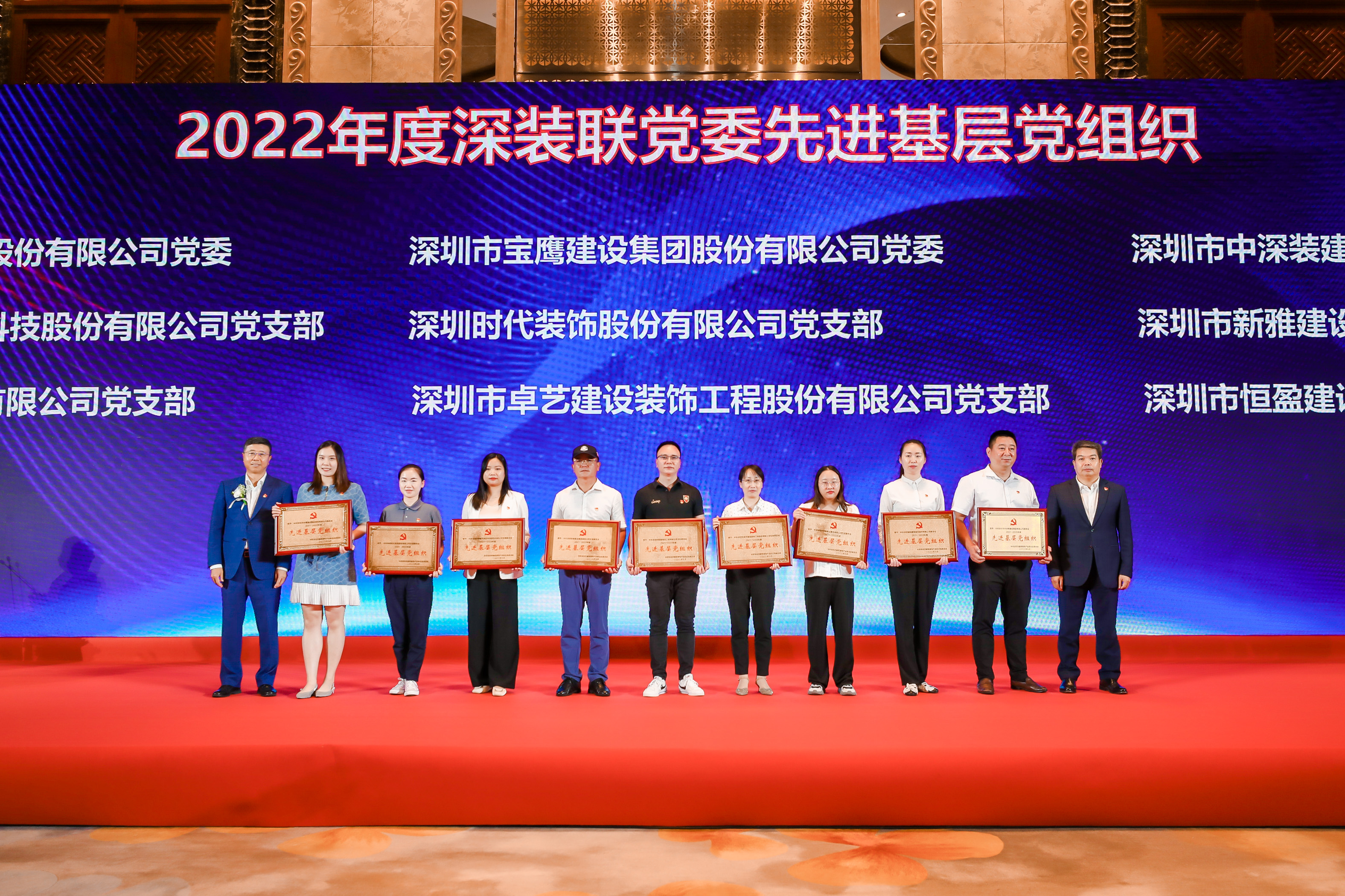 中共深圳时代装饰股份有限公司支部委员会获得2021-2022年度先进基层党组织(公司代表付玎玎领奖:左三)